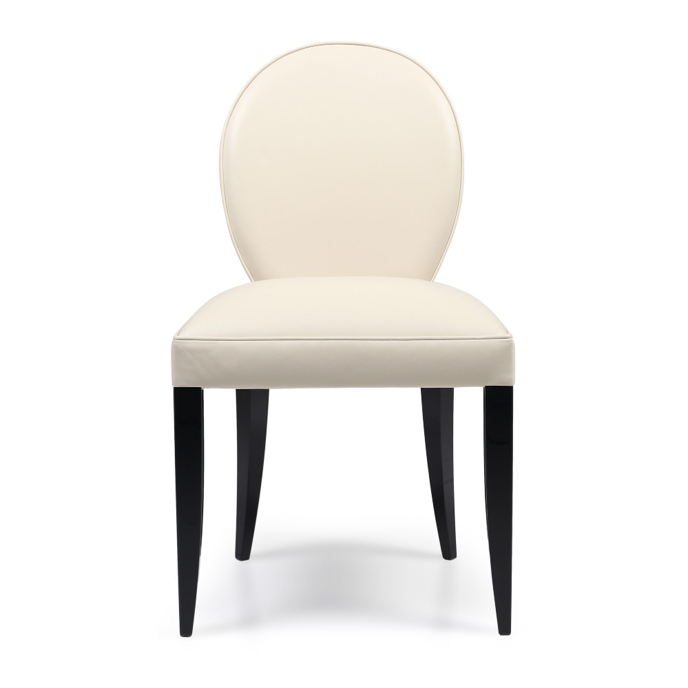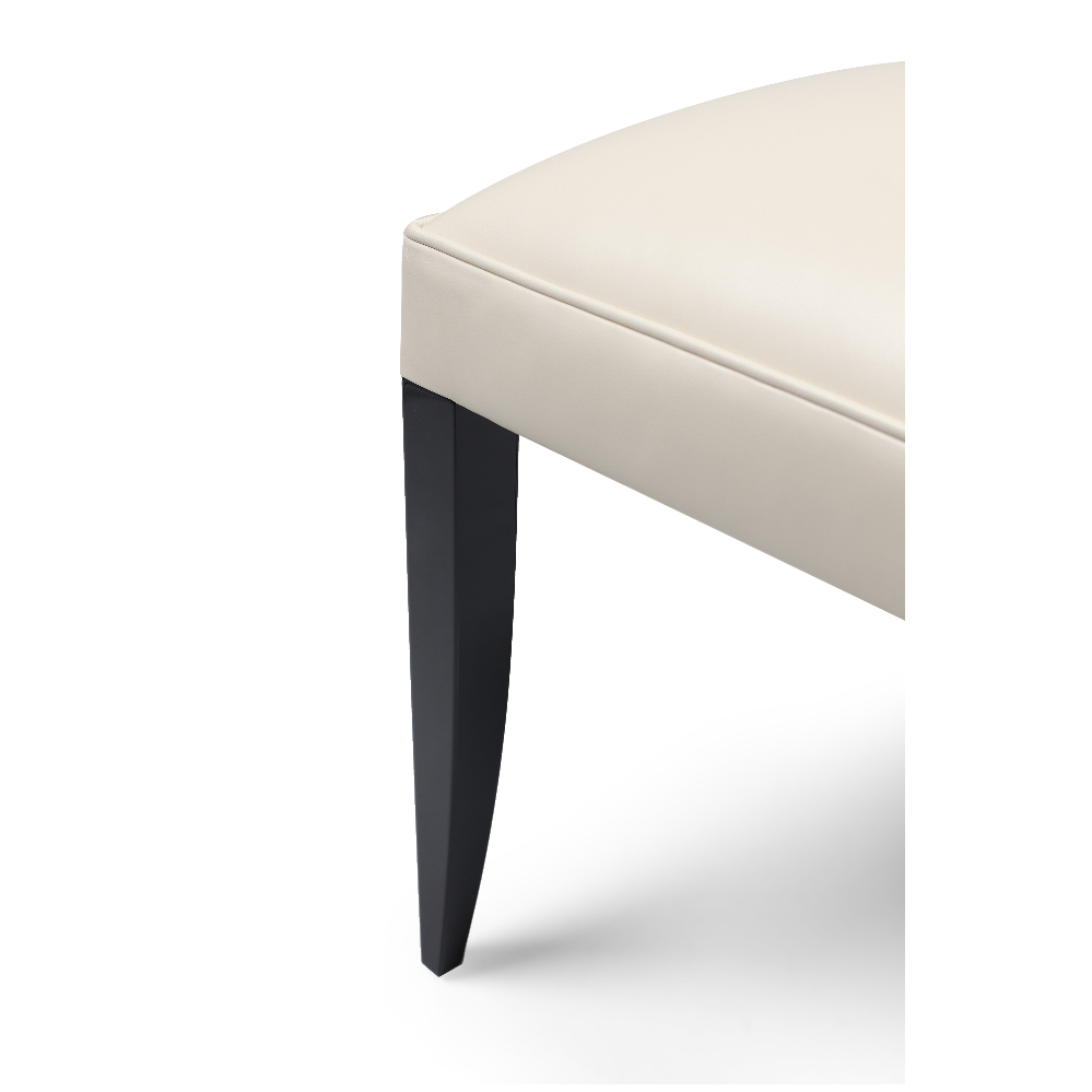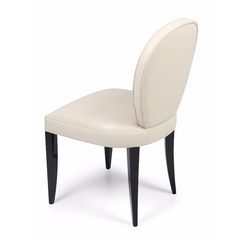 Adela is an updated version of the classic bustle-back chair, fully upholstered, with saddle-stitch and piping detail.