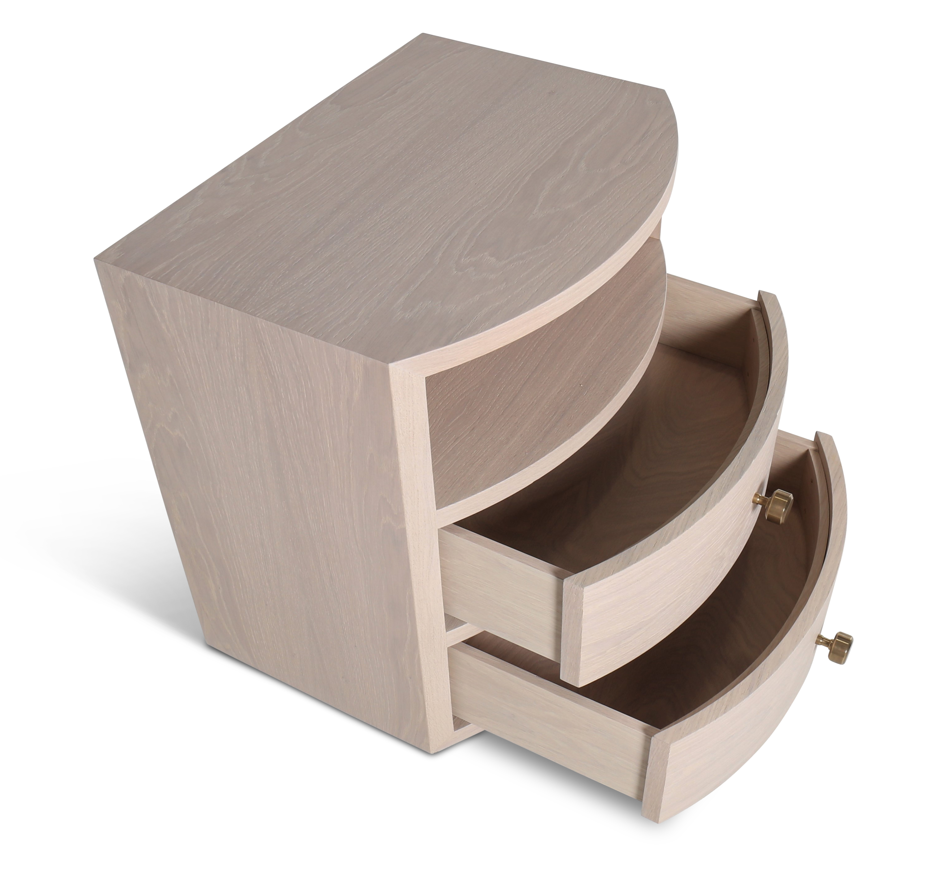 The Batavia bedside table is a curved timber table shown here in open grain oak. This bedside table has two drawers and an open top compartment.