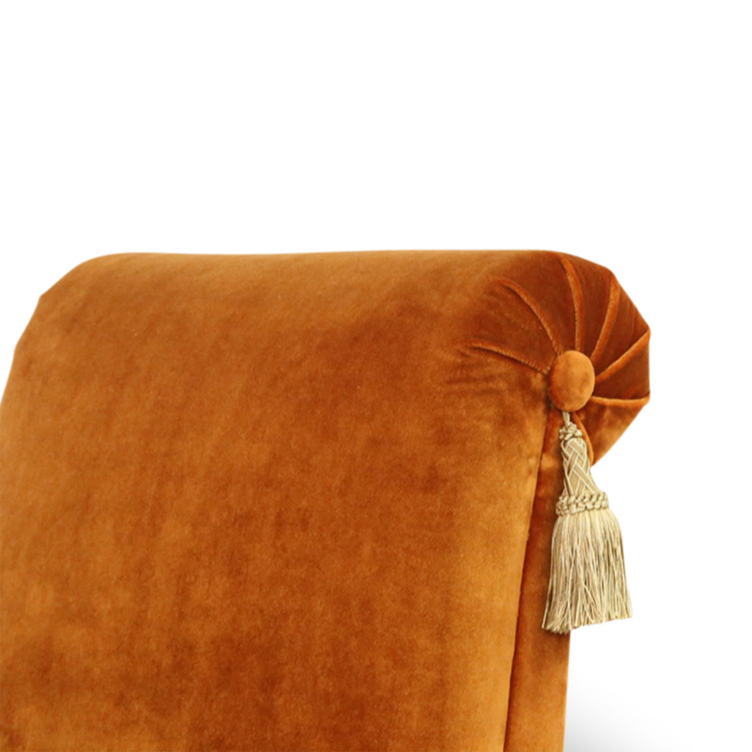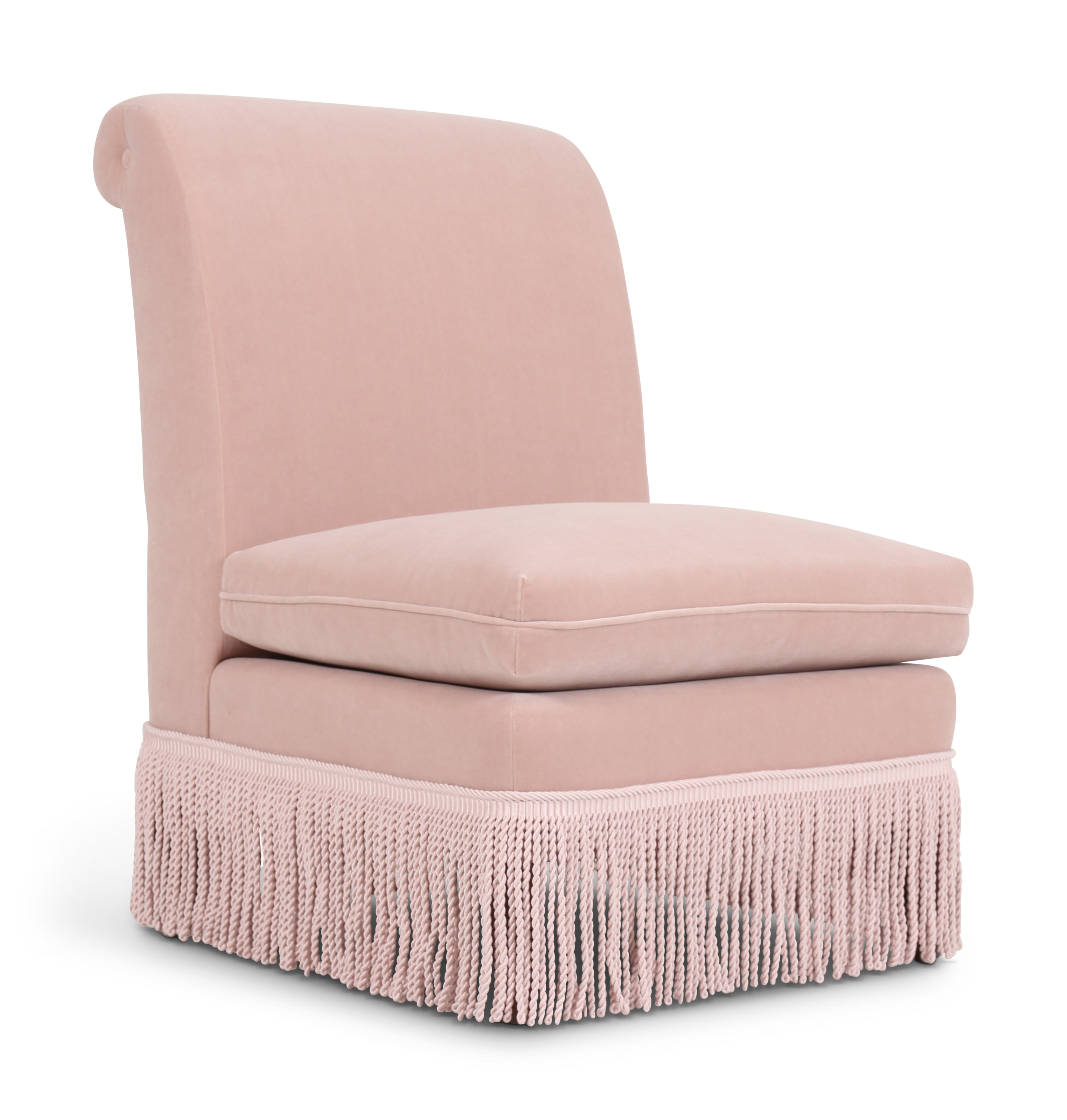 The Topaz occasional chair offers a regal touch to the living area, with a scroll back and thick seat cushion. The Topaz is shown here with a fringe, covering timber legs.