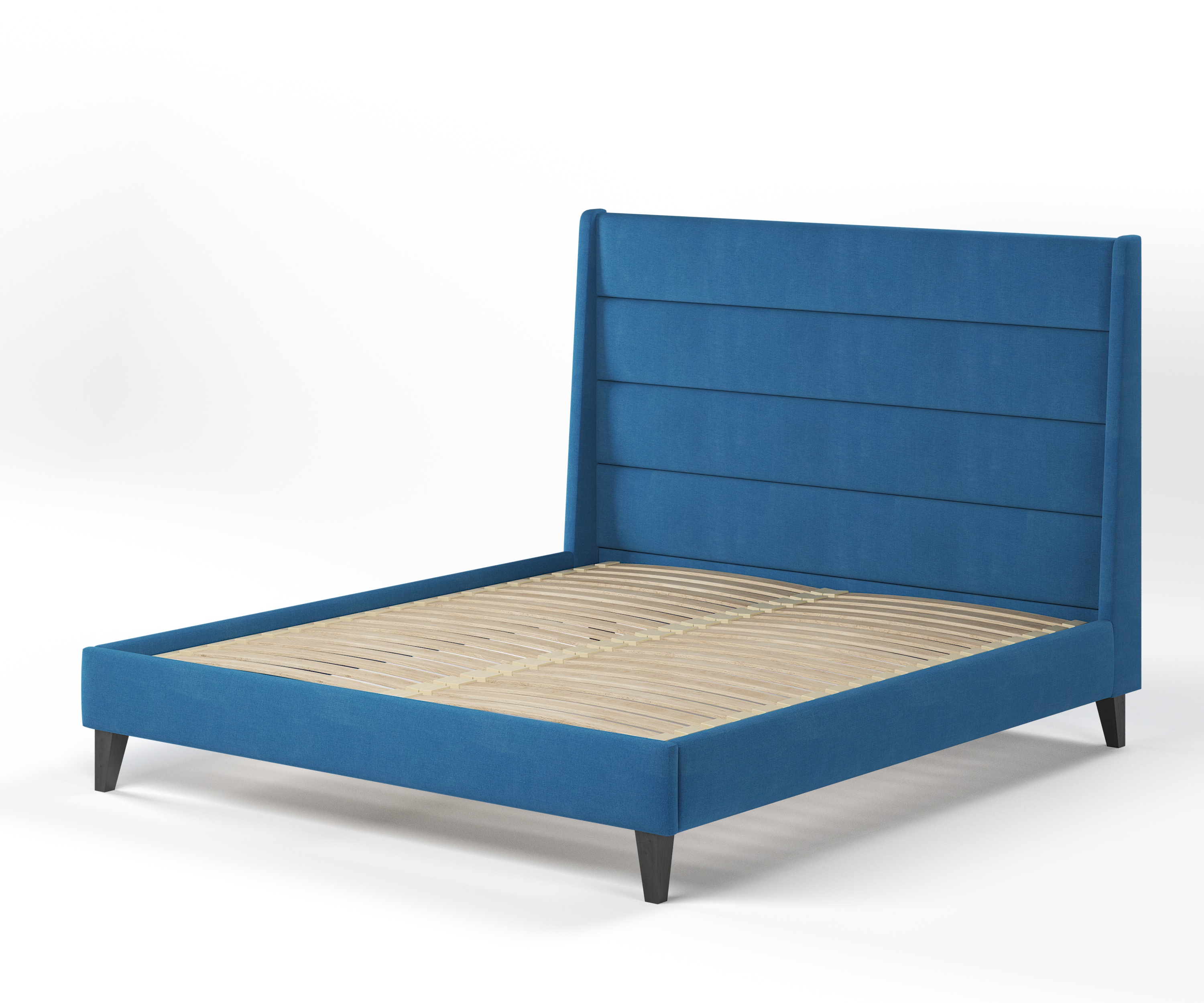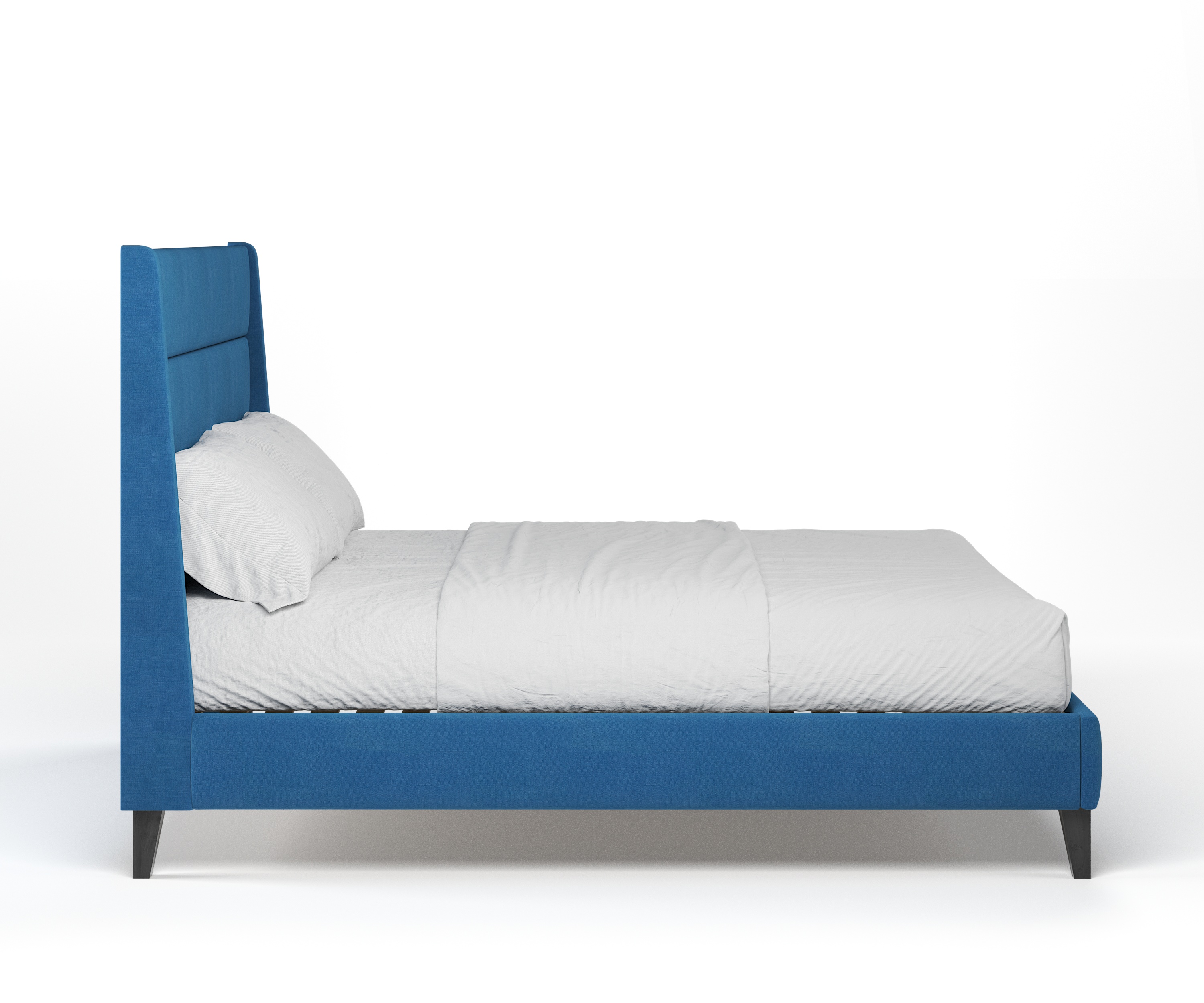 The Bath bed has a winged headboard with a horizontal fluting detail. The plinth and legs are made of timber, shown here in blackened walnut.