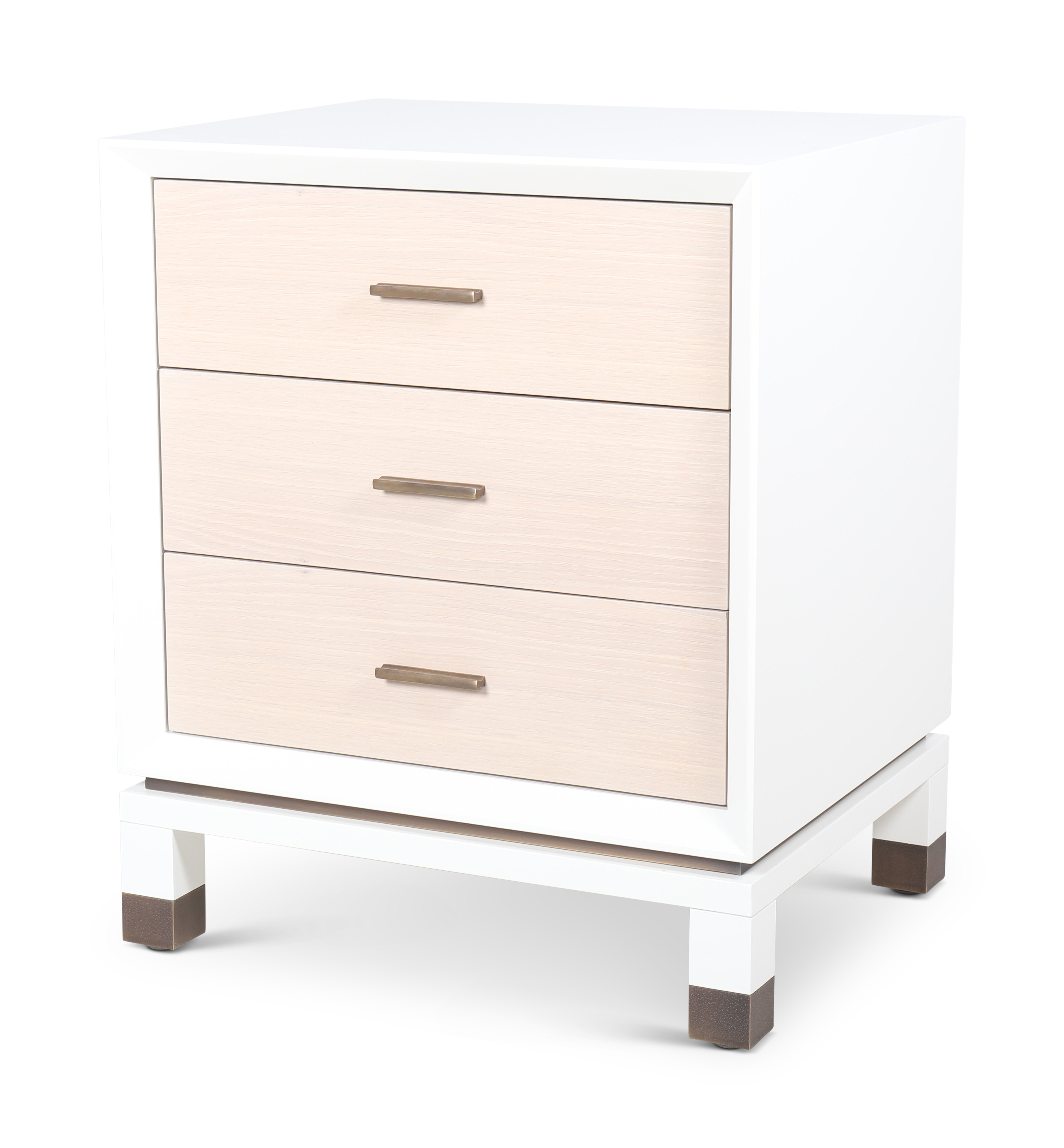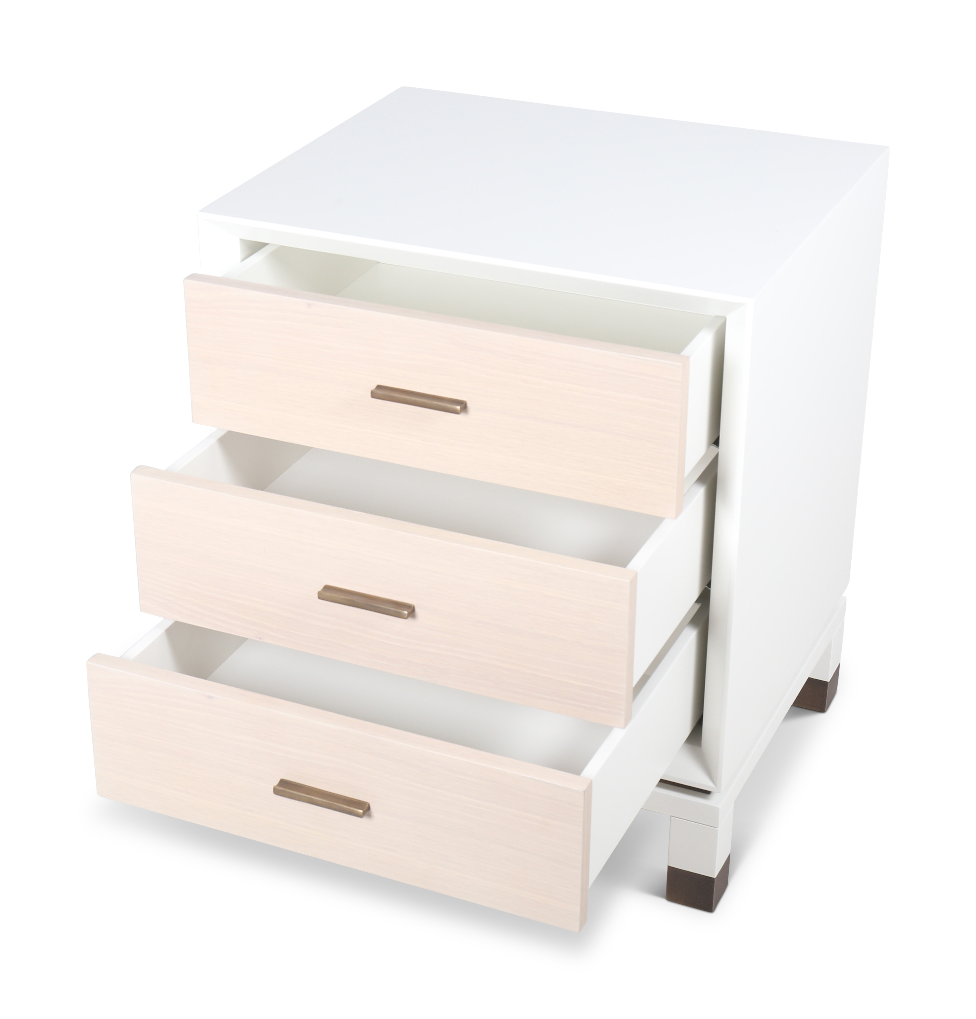 The Ludlow is a bedside table that makes the details stand out. The 3 drawers are inset into the table with a slanted border and have metal handles. The timber frame features a recessed plinth and sabots on the feet.
