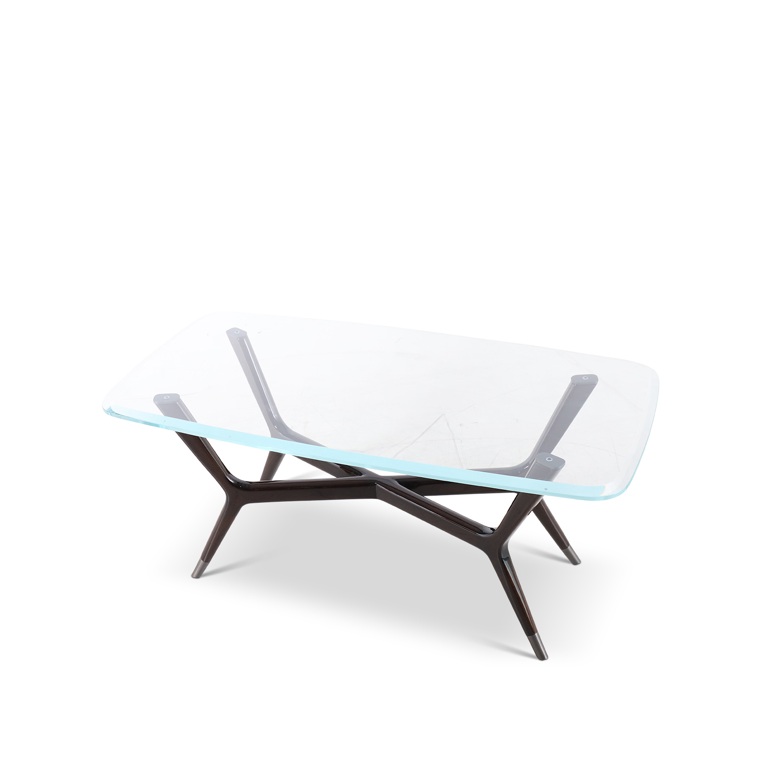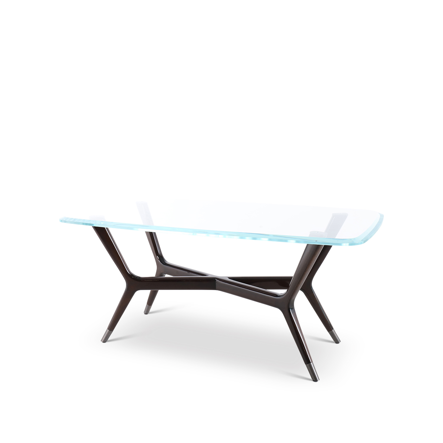 A combination of materials, with a sleek glass top and sculptural wooden base. The fluid, organic lines of the dark wood frame create a sense of movement, making this piece a stunning and artistic focal point in any luxurious interior.