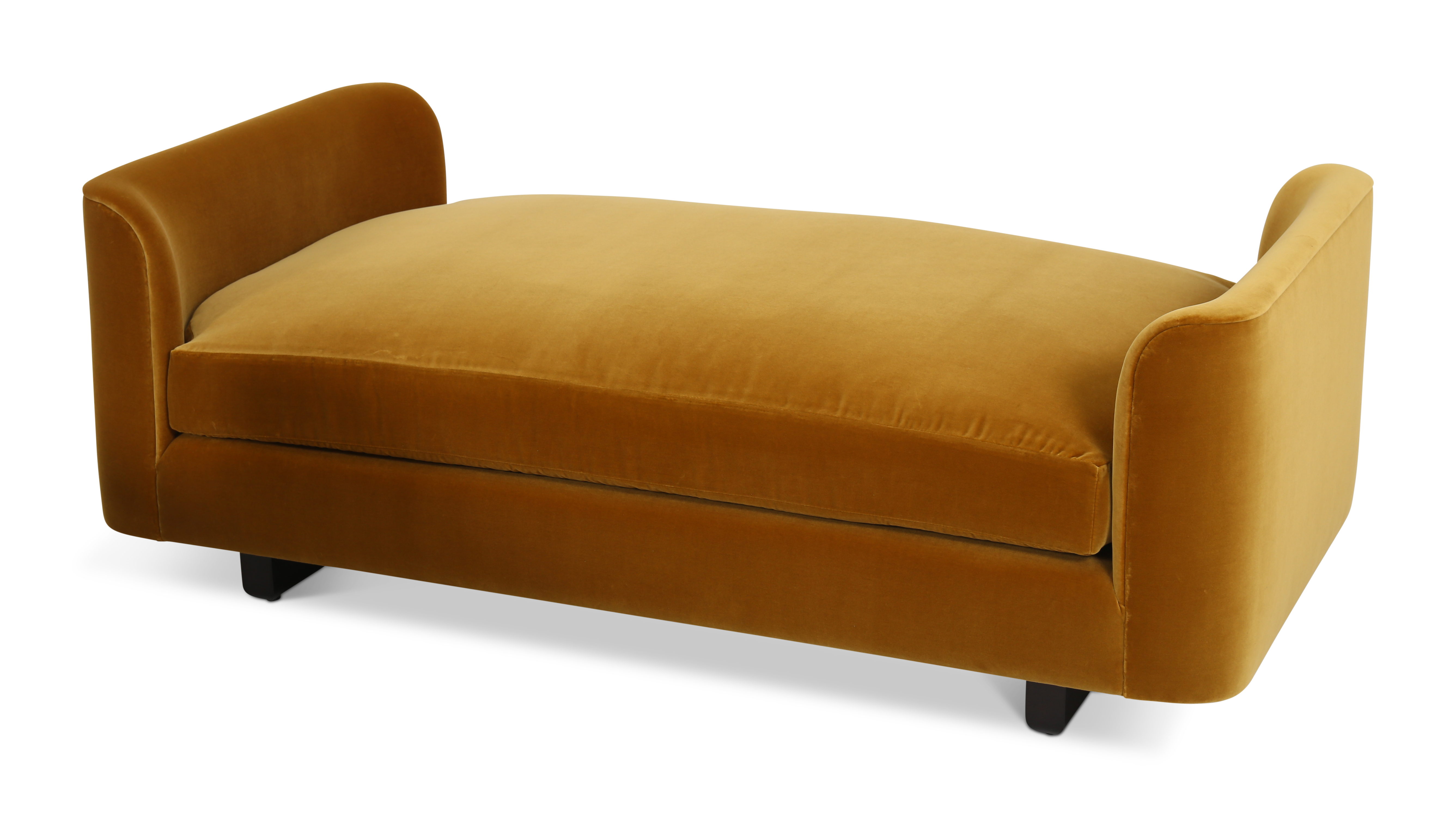 The Fieldgate daybad is an elegant cross between a daybed and a bench, with deep seat and curved armrests. The bench also features 2 timber legs, shown here in oak.