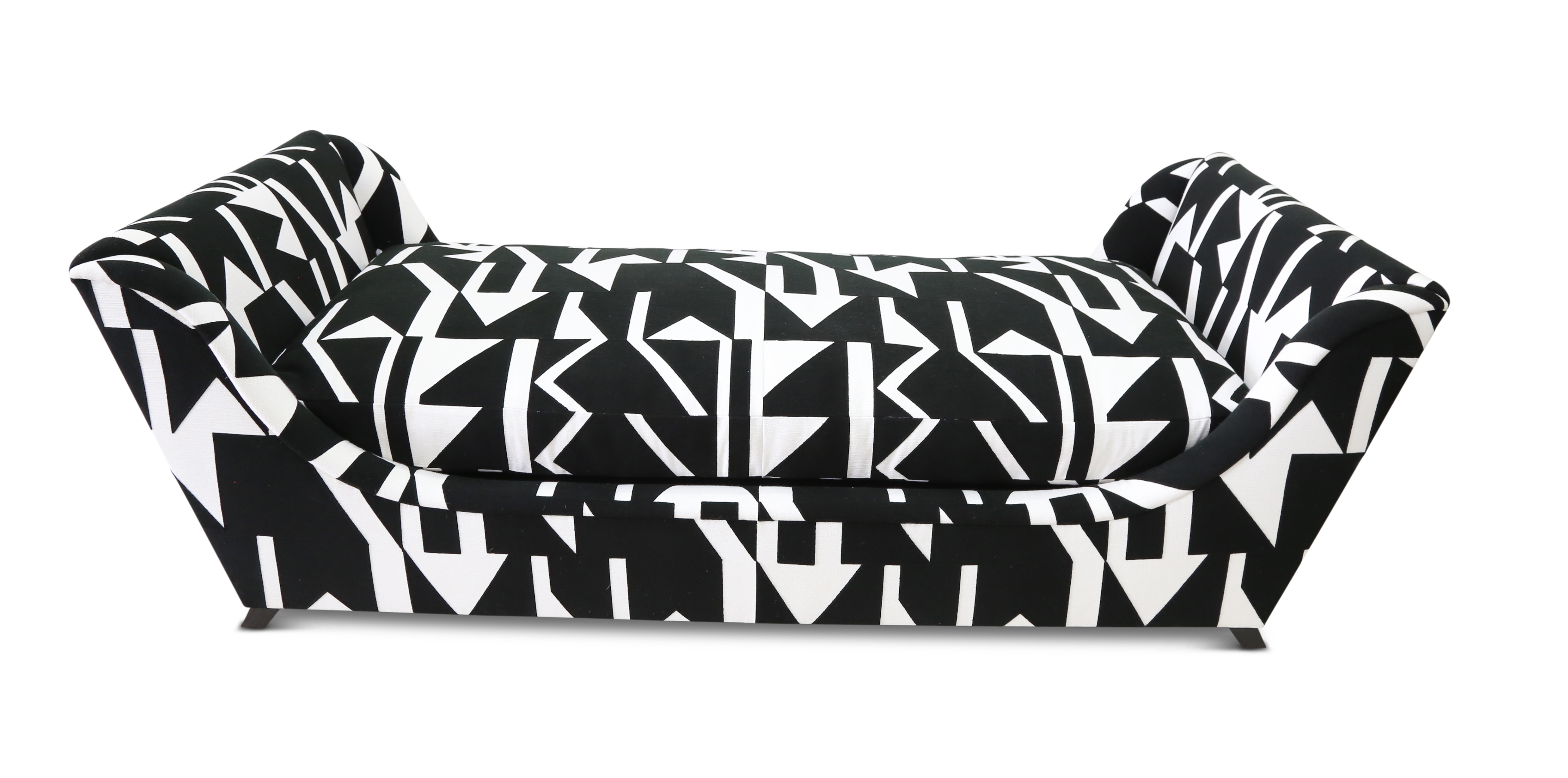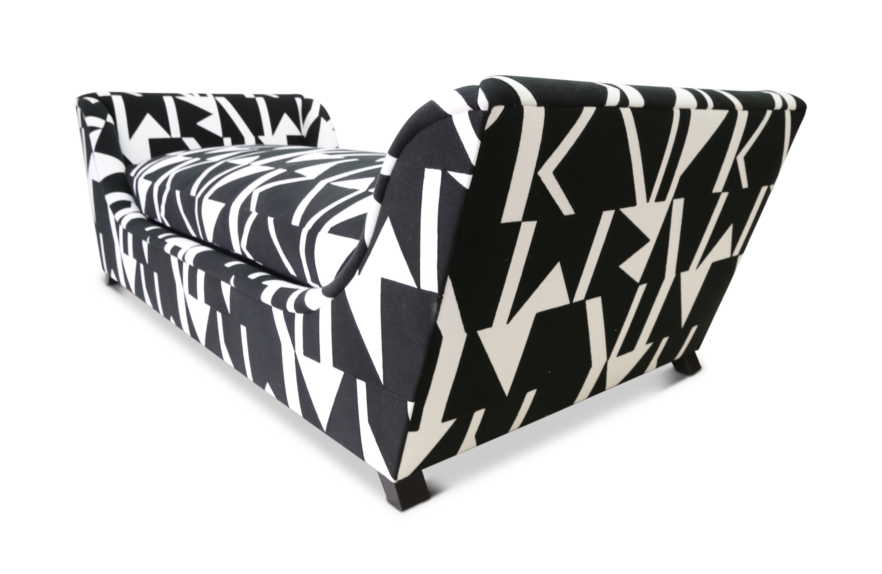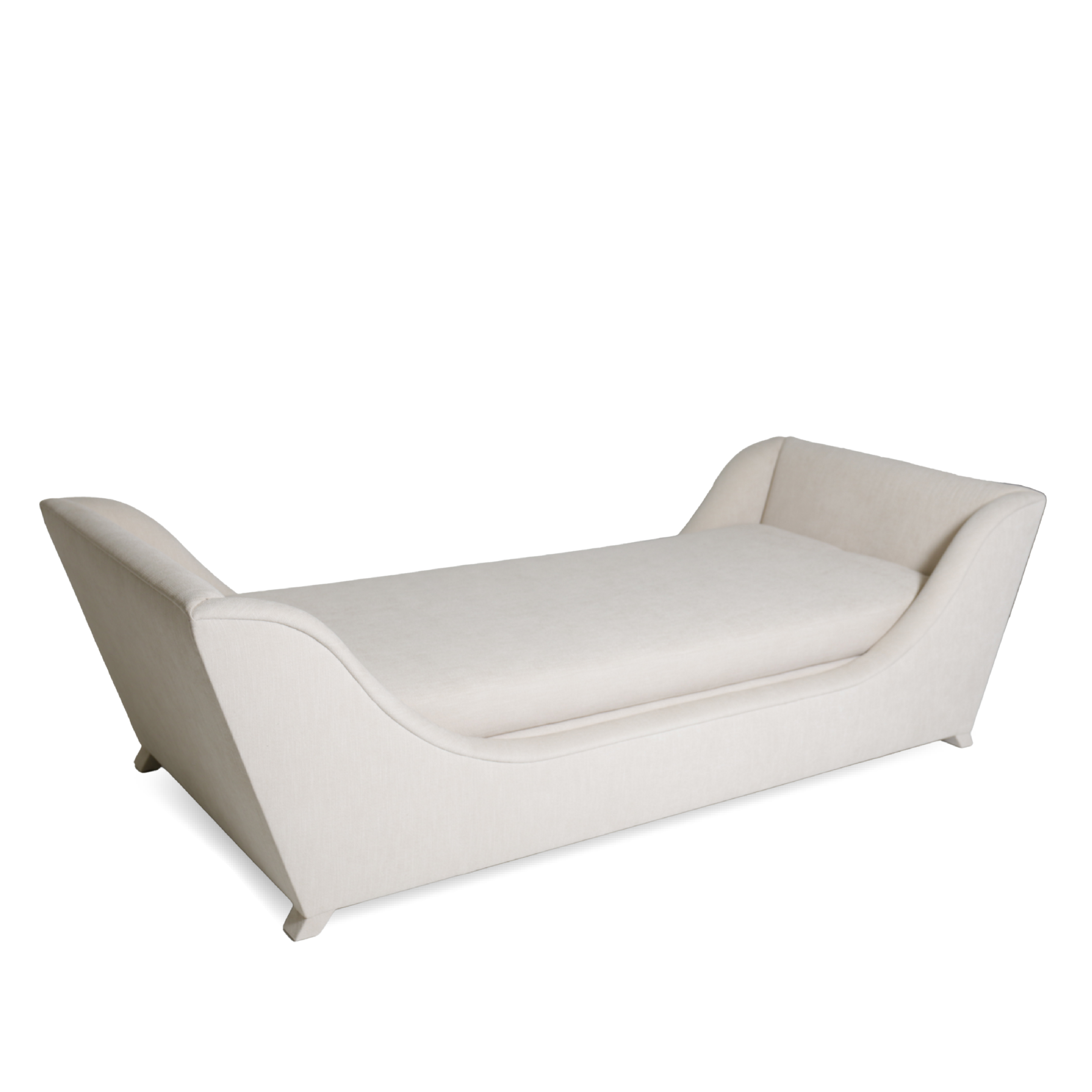 The Raynersrond daybed has a boat-like shape, with the outer frame enveloping a thick seat cushion. This daybed has sloping armrests and timber legs, shown here in beech.