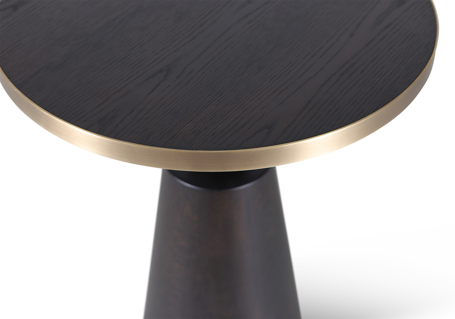 The Duckett side table has a turned solid timber base and metal trim the the edge of the top, shown here in Bison Beech and Antique brass.