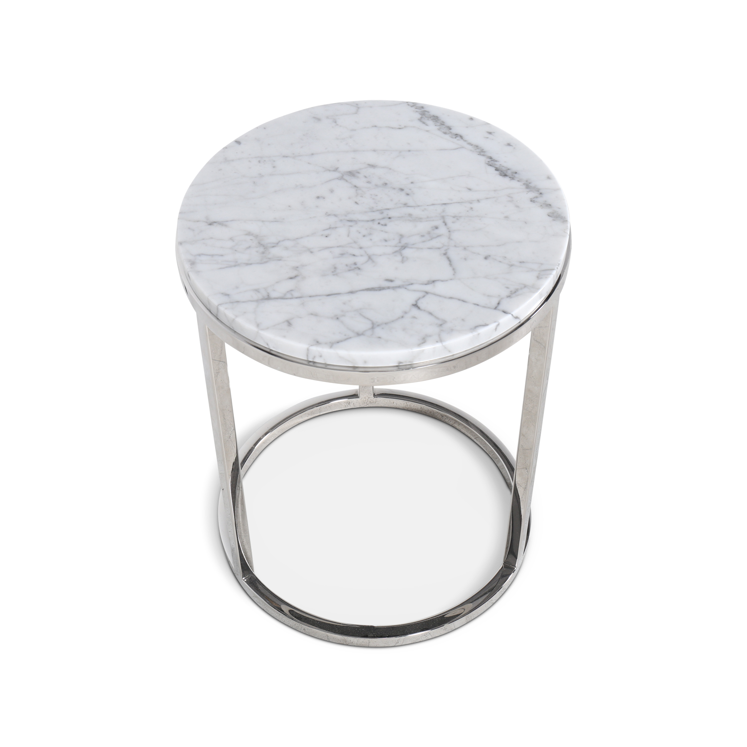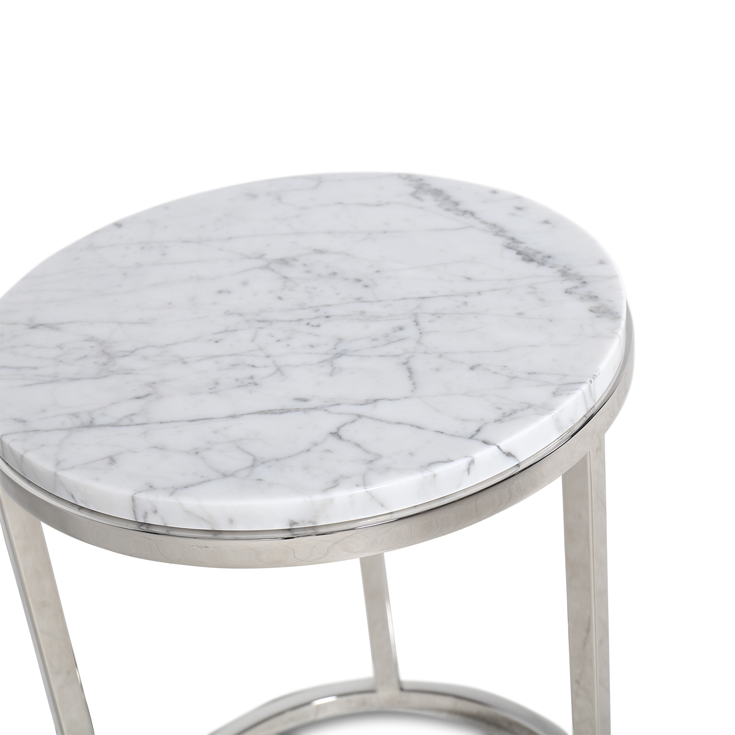 The Newling side table features a refined, round marble top resting on a sleek, open-frame metal base. Combining simplicity with sophistication, it serves as a versatile accent piece that complements both classic and contemporary interiors.