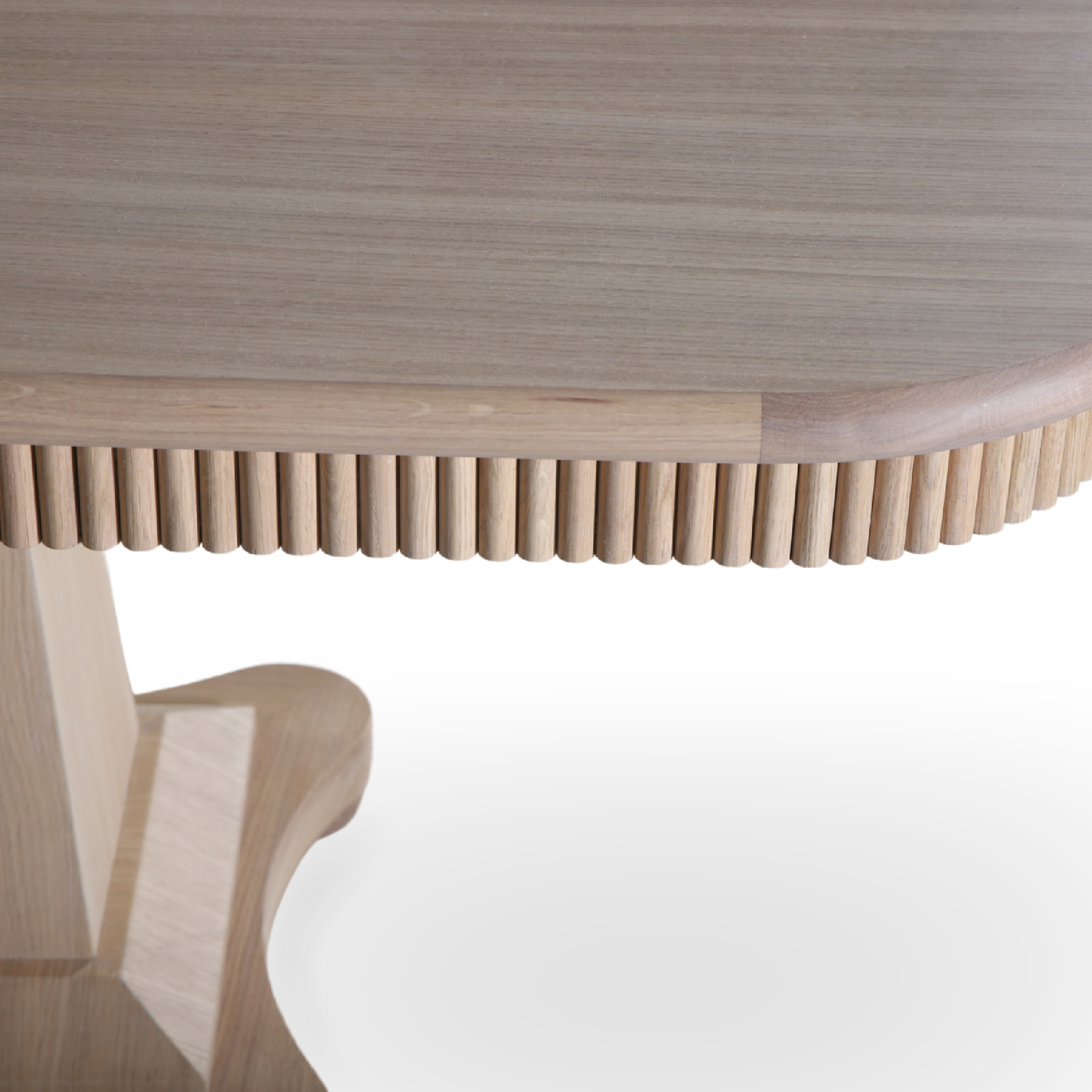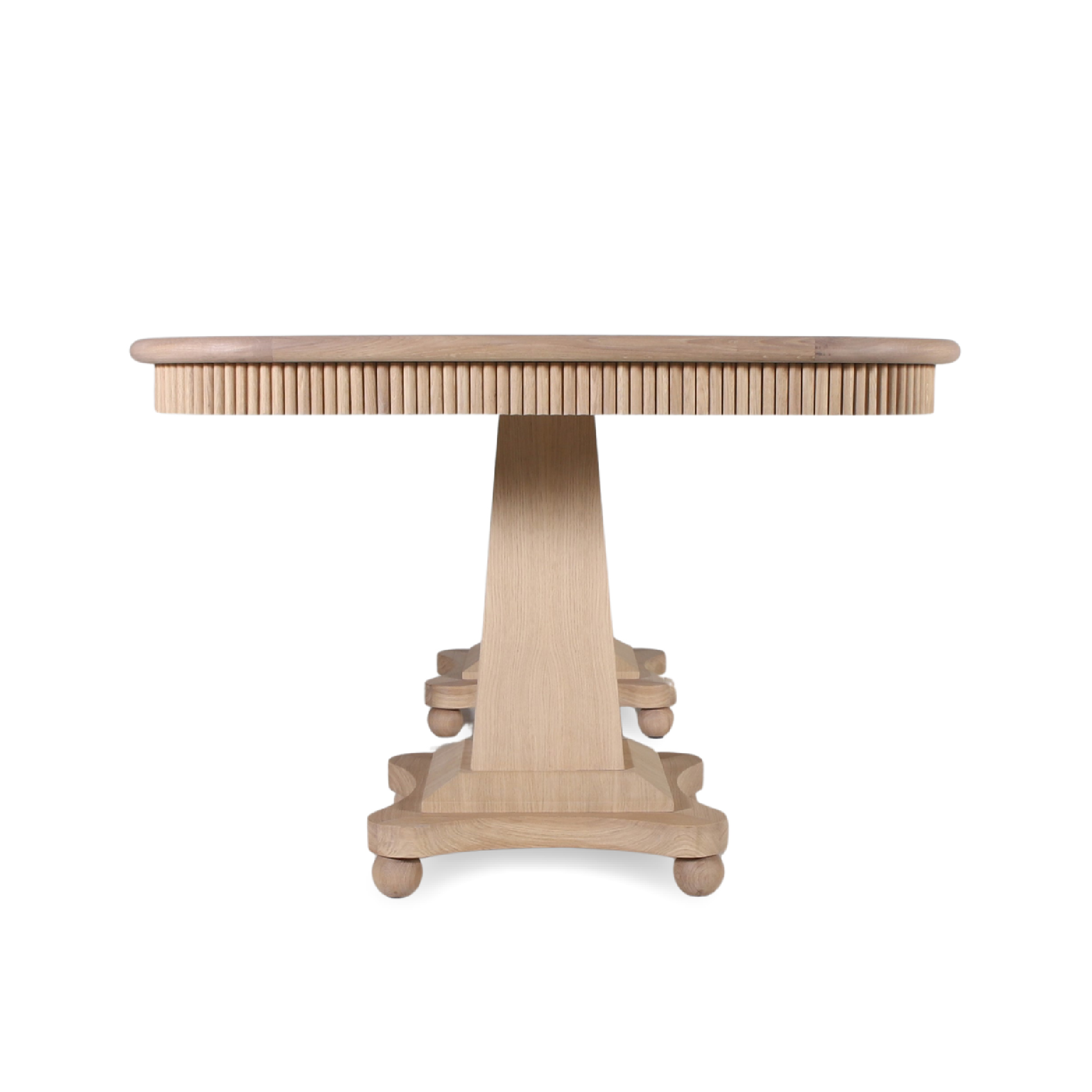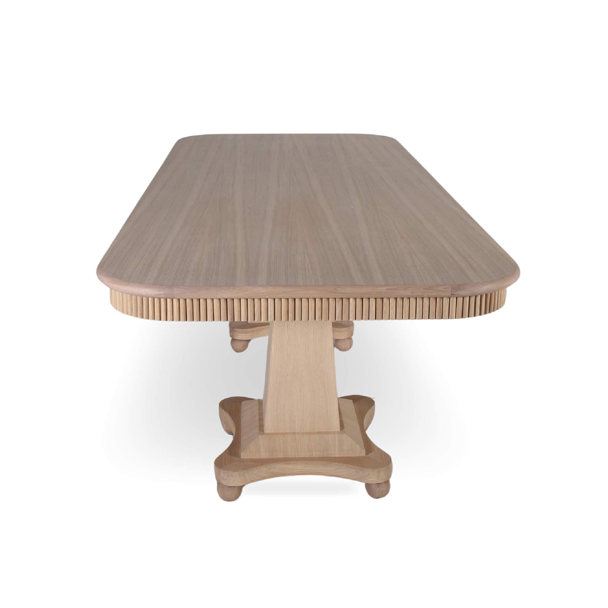The Brookdale dining table showcases timeless craftsmanship with a refined top framed by reeded detailing along the apron. The intricate linear accents lend texture and sophistication, elevating its clean silhouette. Supported by twin pedestal bases with tapered forms, stepped plinths, and rounded feet, the design balances elegance with stability. A statement piece for any dining setting, it brings both presence and enduring style to the room.