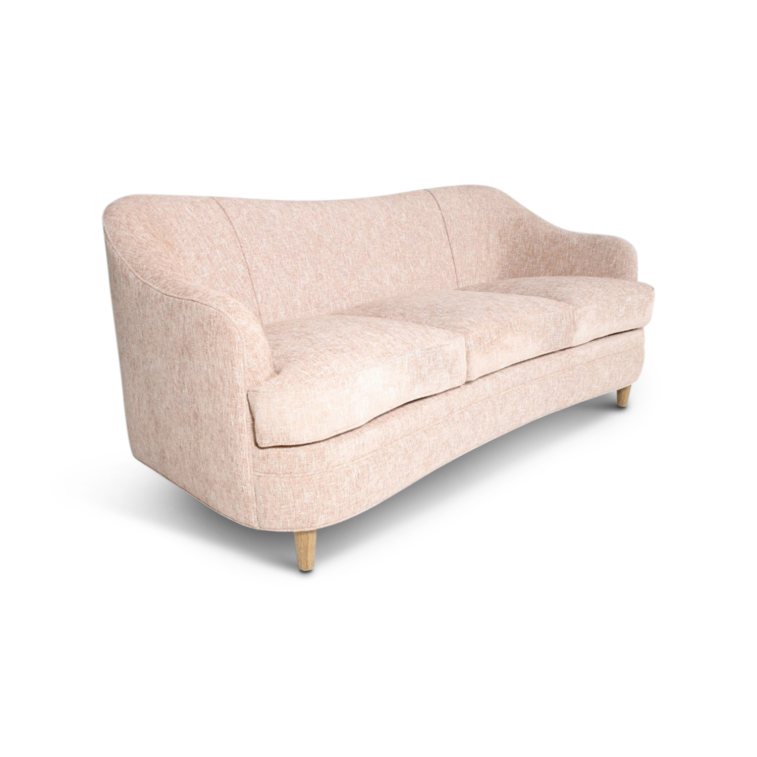 The Darlington sofa has a fluid look, with a curved back and arms, as well as a slightly curved seat. The Darlington features thick seat cushions and timber legs, shown here in mahogany.