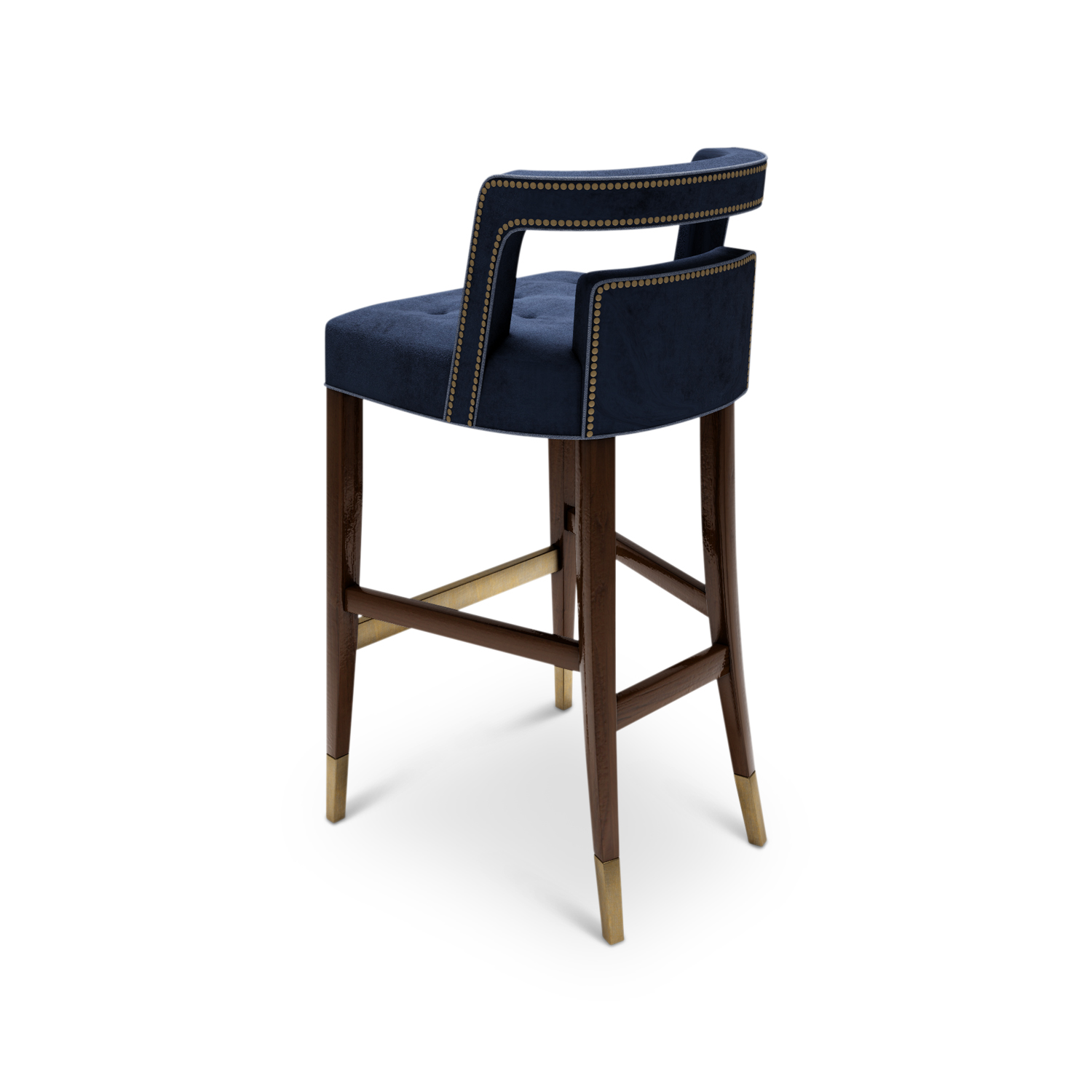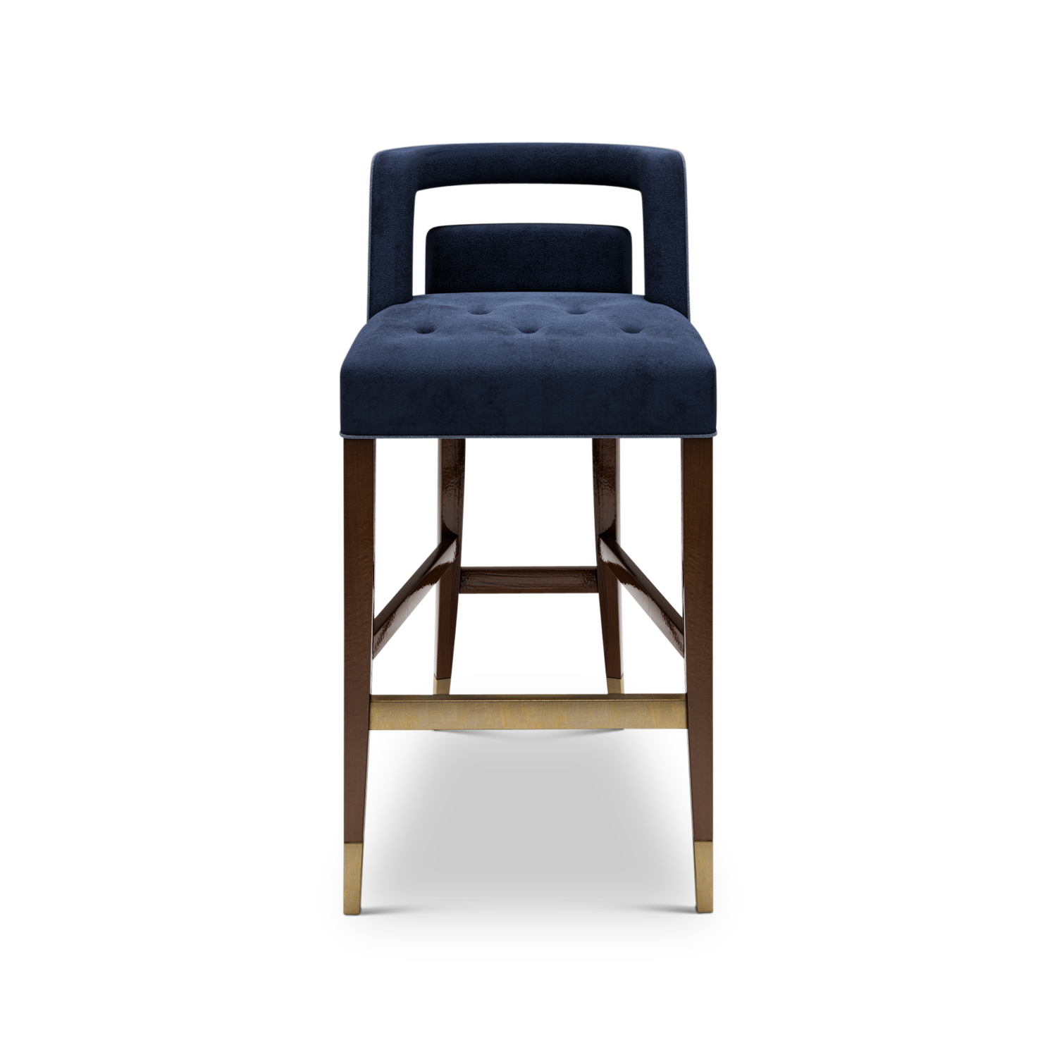 The Glenloch bar stool has an upholstered square seat and backrest, with a luxurious deep buttoned seat. Timber legs end with a metal kick plate and sabots.