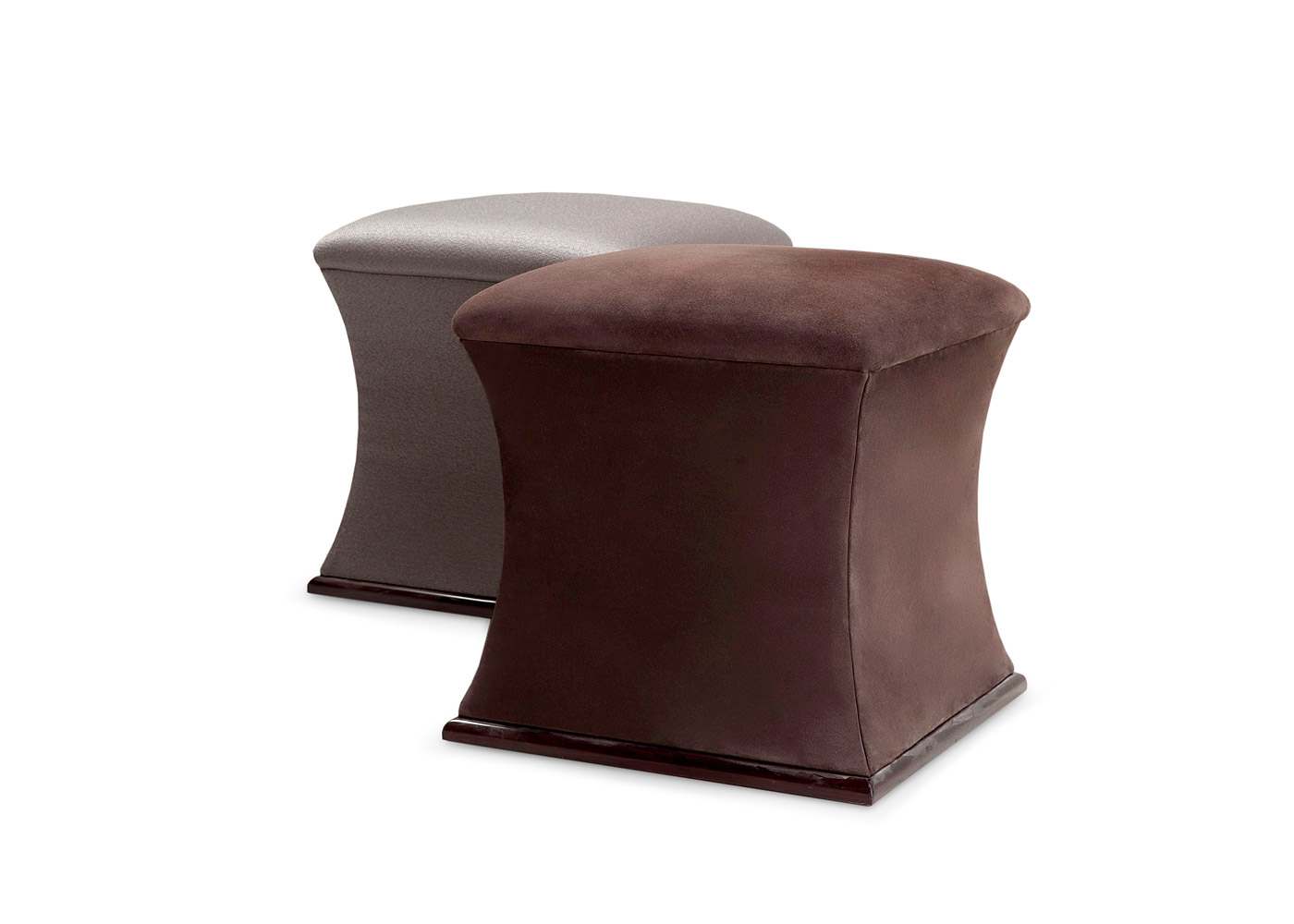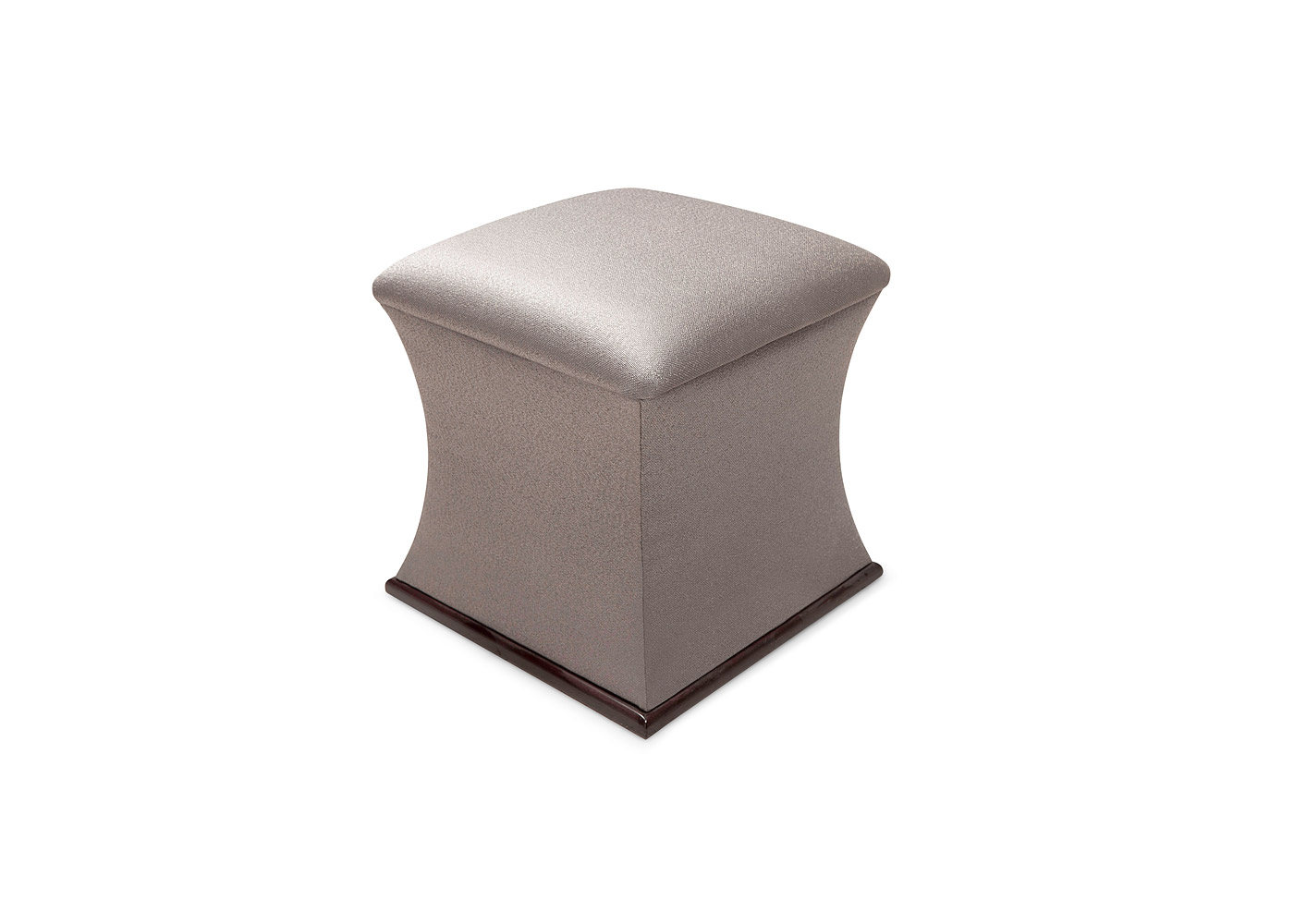 The Harbet stool allows for a multitude of purposes. Provides additional seating without taking up too much space and is often used to brighten a room with accent fabrics. Stands on a wooden base for an elegant added detail. Fully upholstered and available in two sizes.