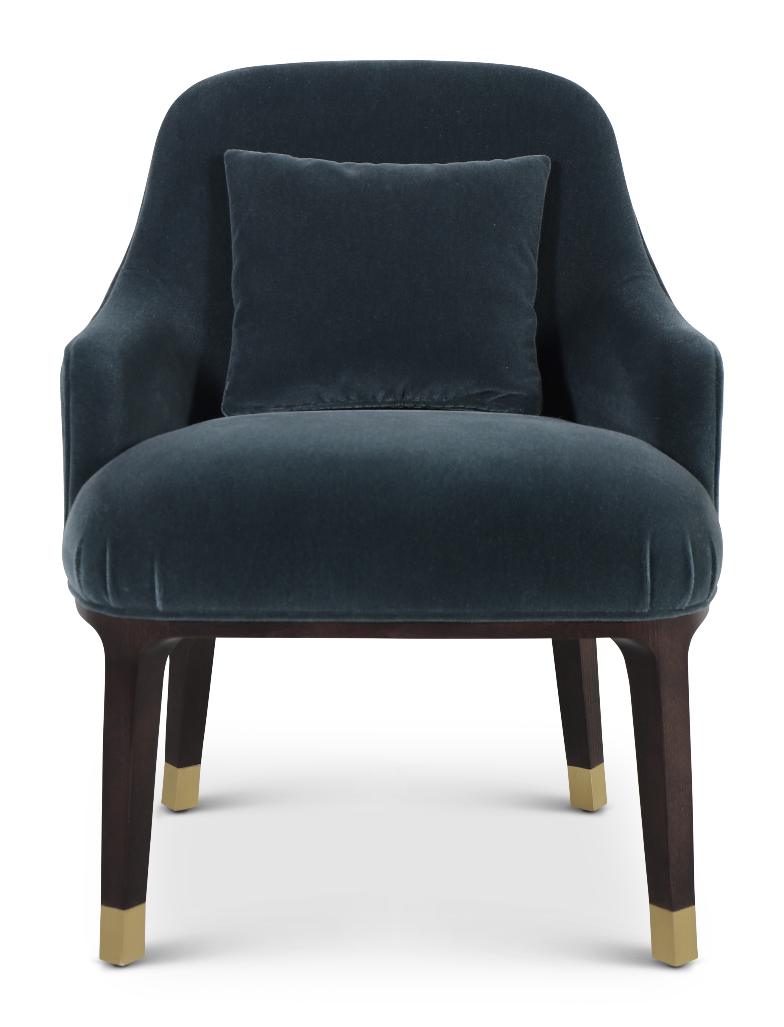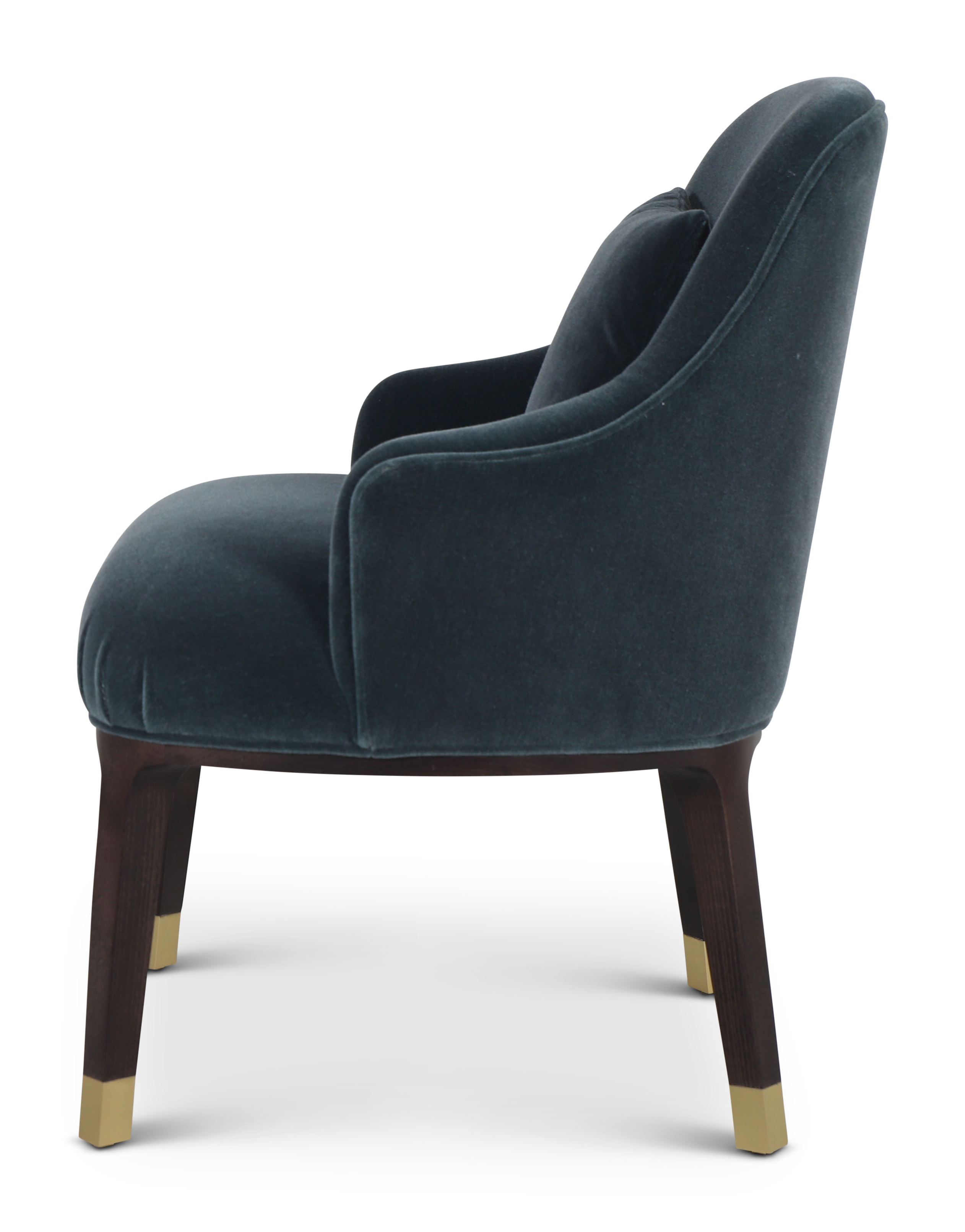 The Landon’s refined dining chair balances contemporary elegance with timeless comfort. The gently curved back and sculpted arms create a graceful, enveloping silhouette, while the tailored seat cushion ensures a supportive, inviting feel. Set on a slender, tapered wood base with sleek sabots, the piece offers a sophisticated contrast of textures and materials. A matching loose cushion adds a touch of relaxed refinement.
