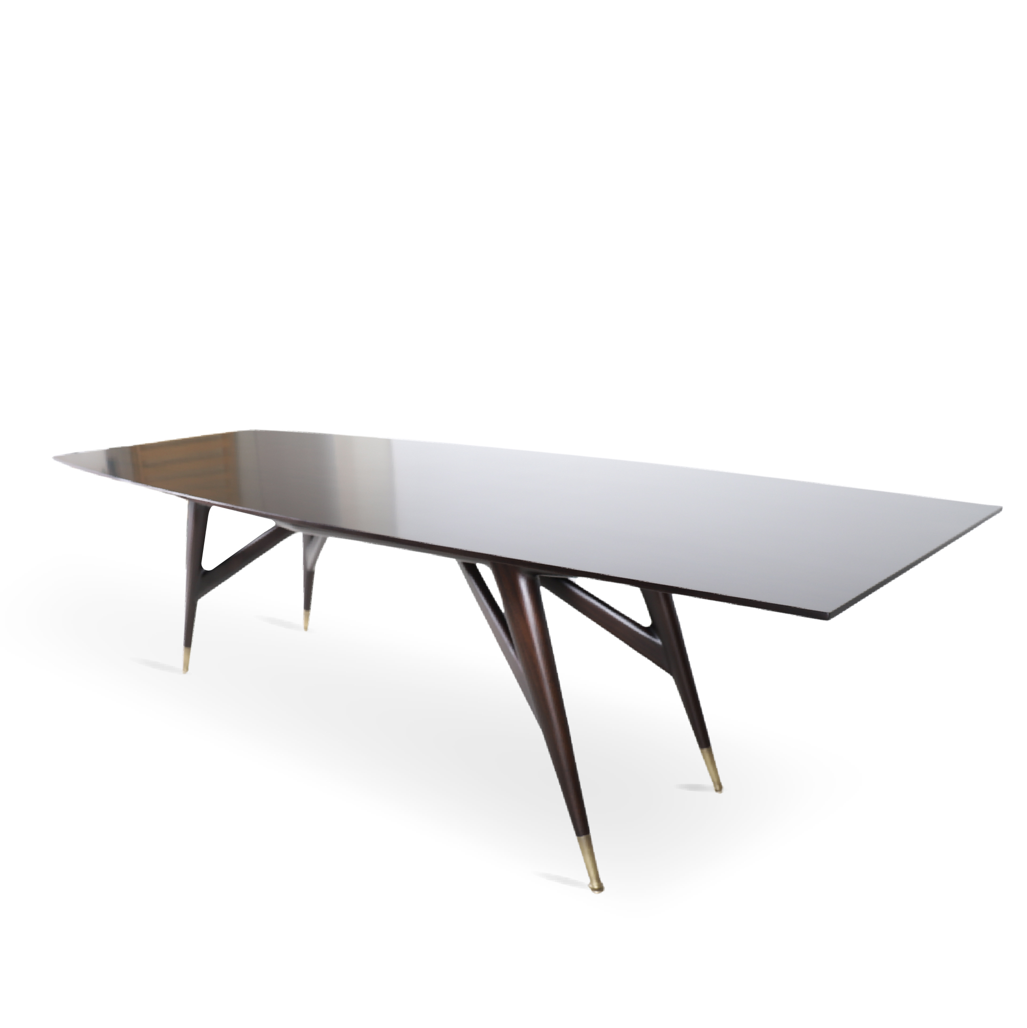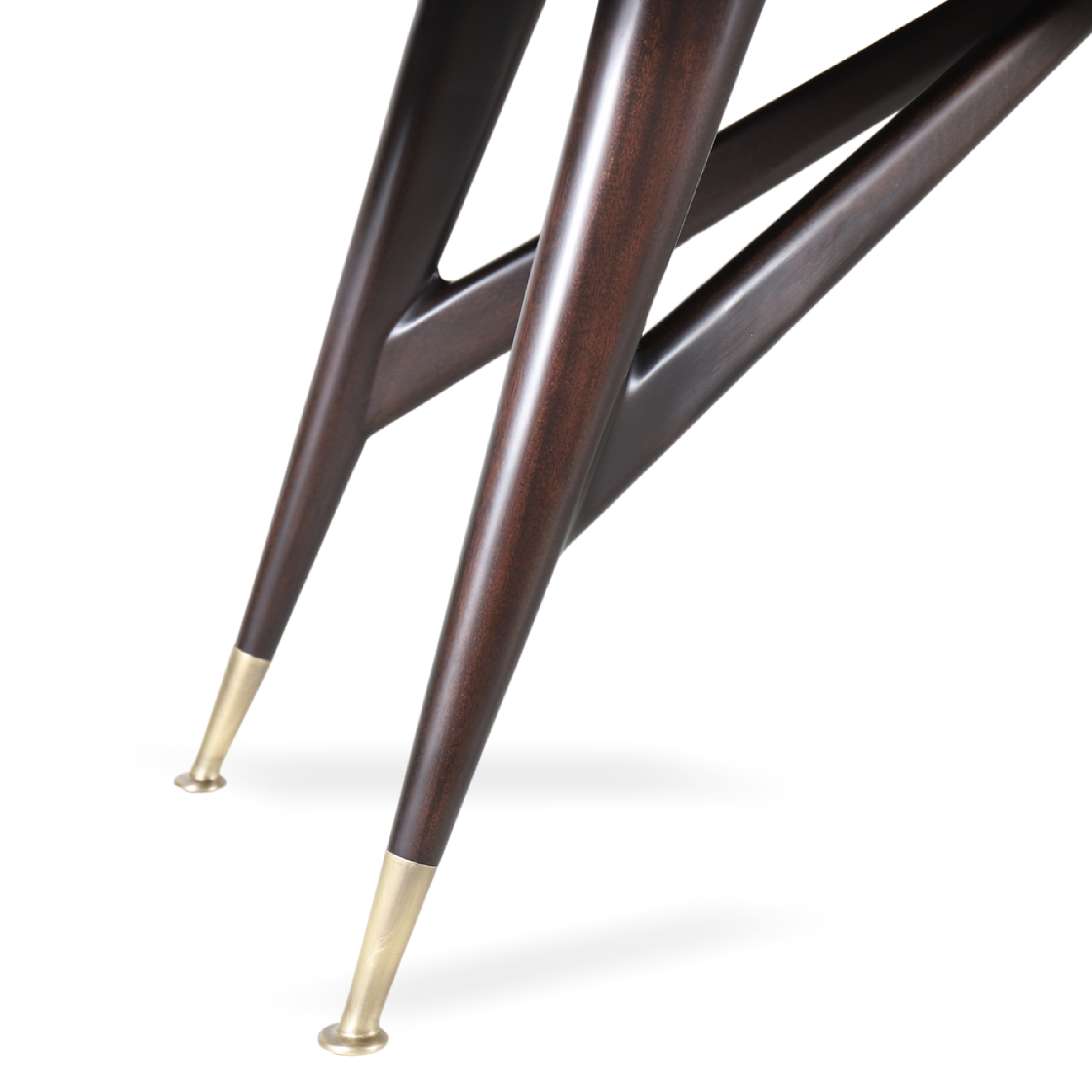 The Leo table is defined by its sleek silhouette and sculptural base. The elongated rectangular top tapers subtly at the ends, creating a refined yet edgy aerodynamic profile. Below, angular legs intersect with dynamic stretcher supports, giving the piece both strength and visual intrigue. Finished with elegant capped feet, the design balances artistry with functionality, making it a striking centrepiece for any dining room.