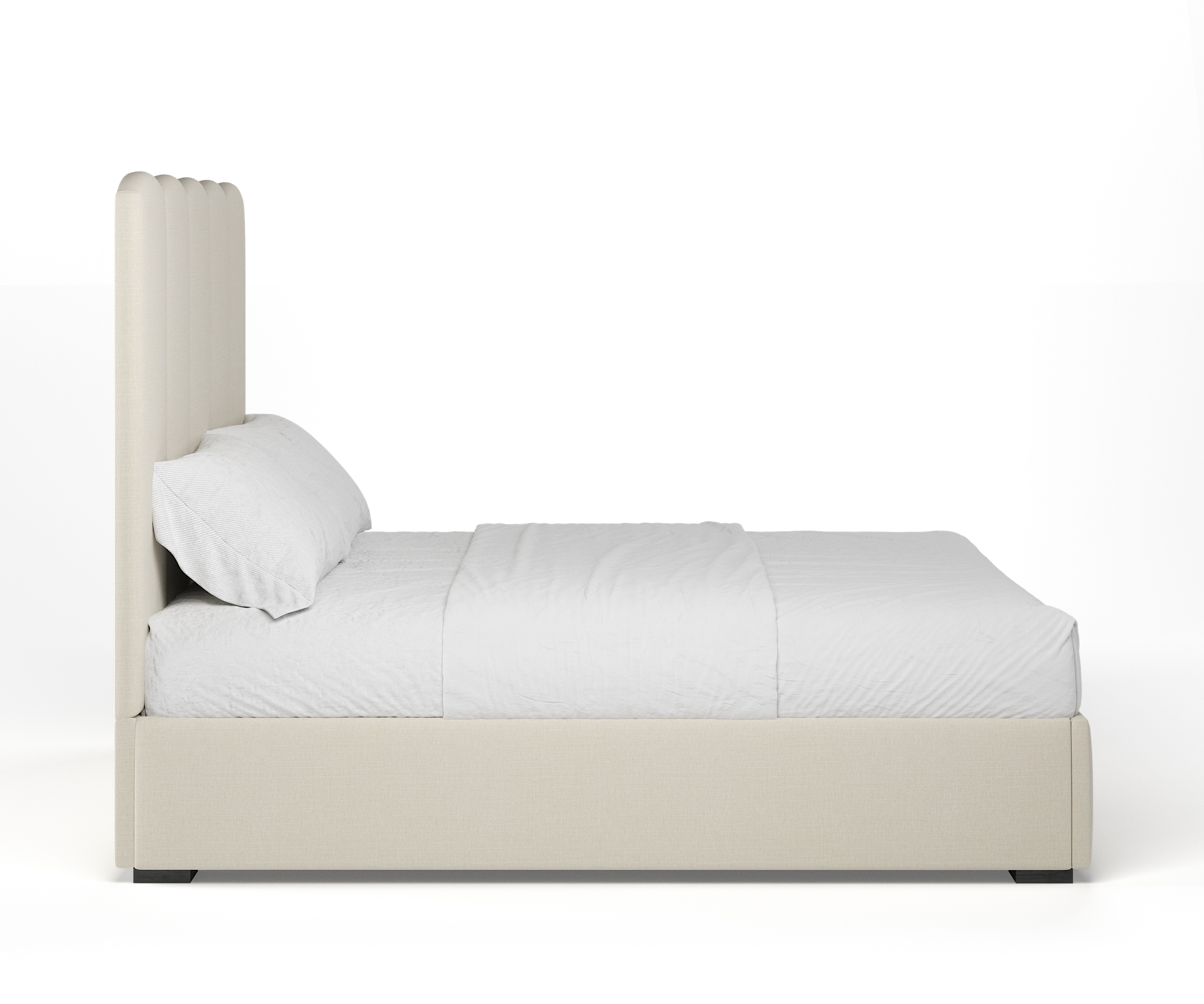 The luxurious Leylang bed has a tall headboard with deep vertical fluting and timber feet, shown here in beech.