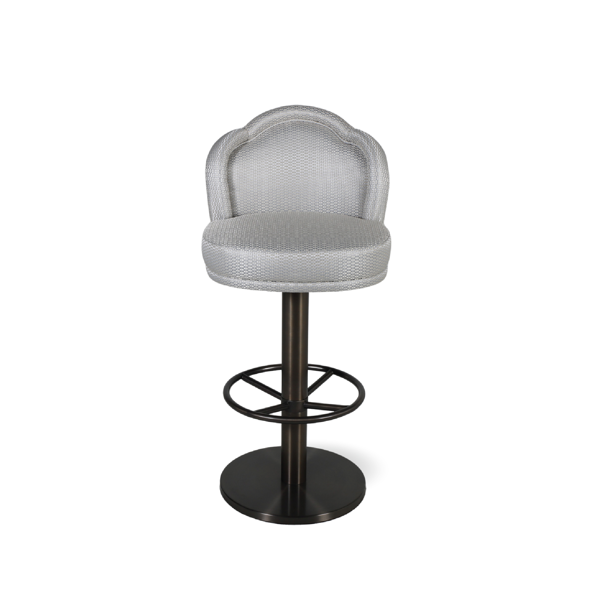 The Lyric bar stool combines elegance with comfort, featuring a sculpted upholstered backrest with graceful curves and a generously cushioned seat, supported by a metal pedestal base with a circular footrest, balancing style and practicality. Refined in detail yet versatile in character, it brings sophistication to both classic and contemporary bar settings.