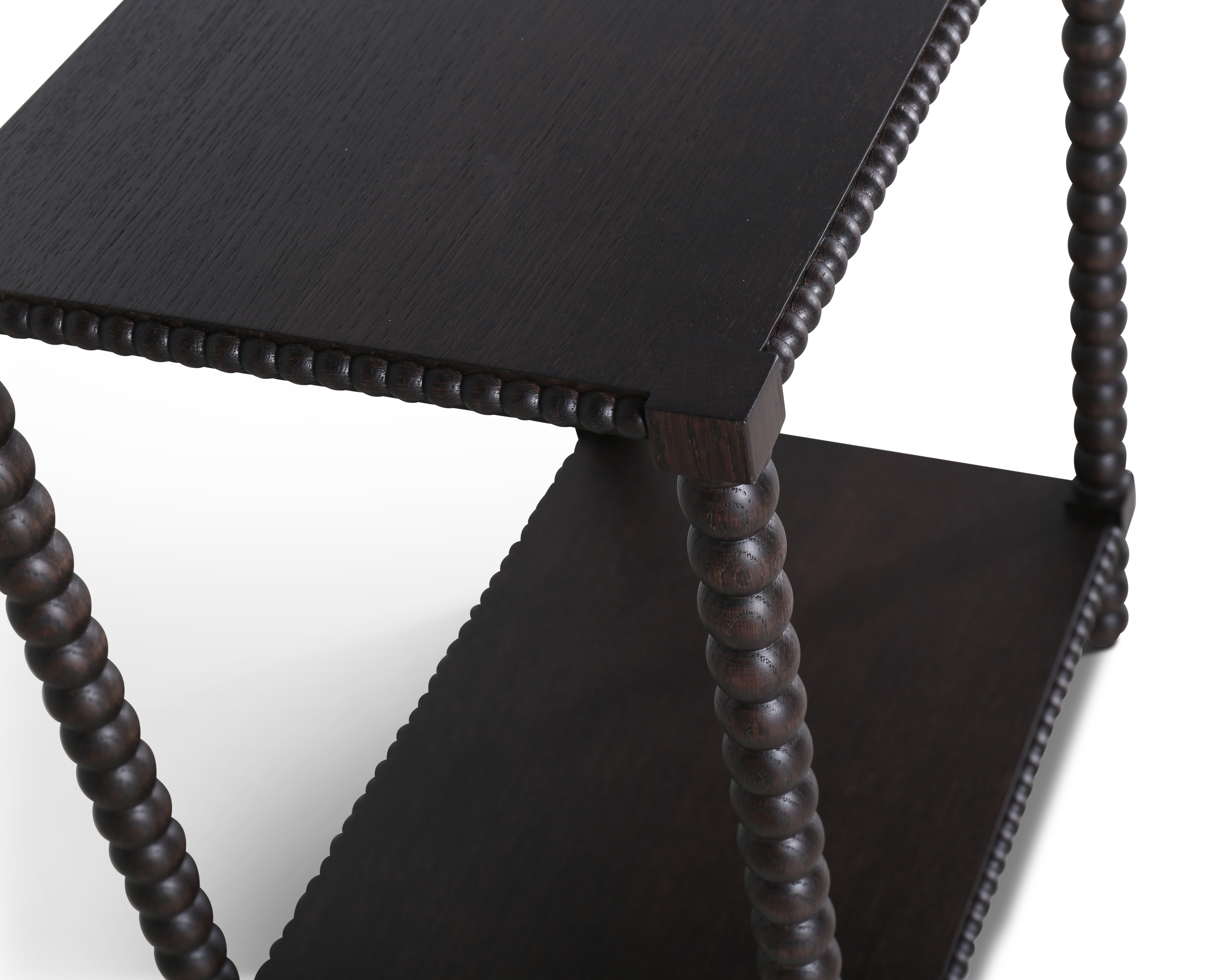 The Tankerton is a classic side table with distinct stacked sphere legs. This sphere detail is repeated around the edges of the table top and bottom shelf, offering complexity to an otherwise simple table.